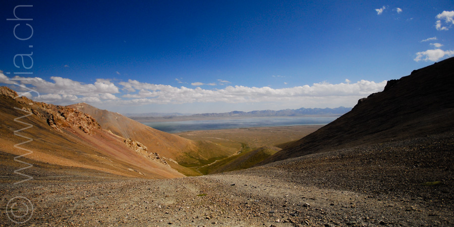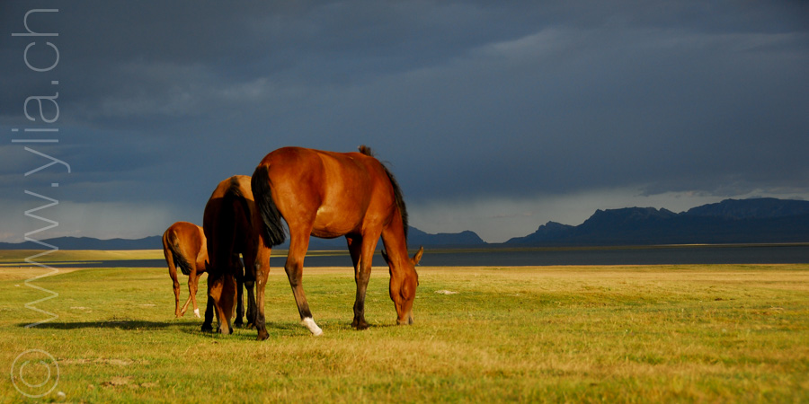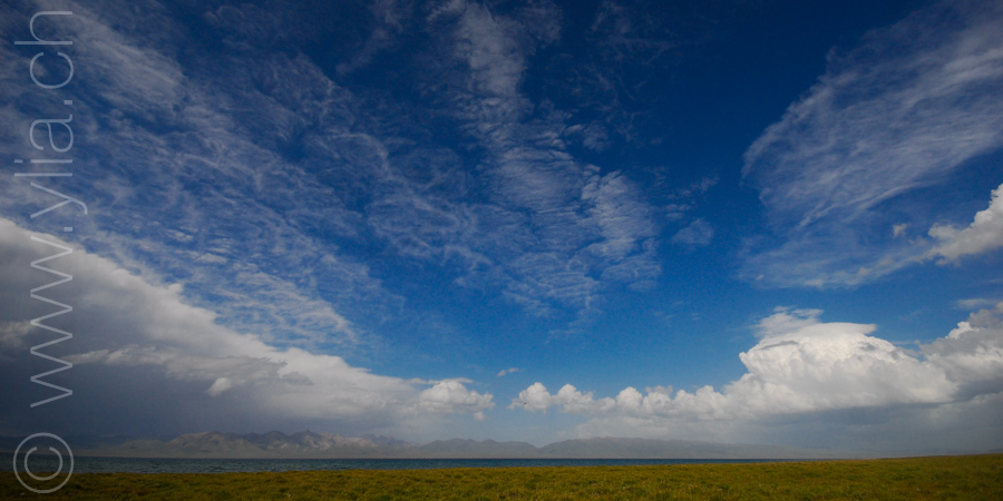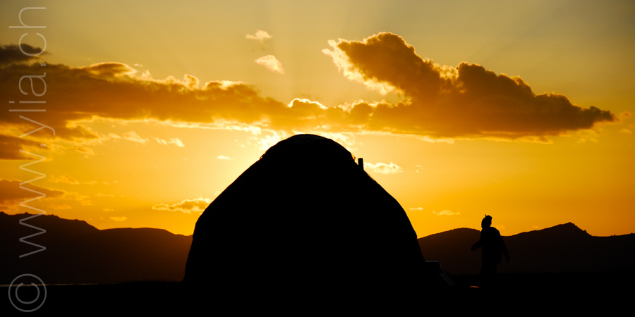 One after the other, we crossed passes to reach the astounding Song Kol lake, which spread in the middle of a vast steppe, smooth like a mirror, reflecting a couple of white cumulus that were gently growing. Over there, storms were violent and powerful thunders and lightenings were echoing on the land. Back clouds created moving waves of rain filtering the red lights of the sunset.