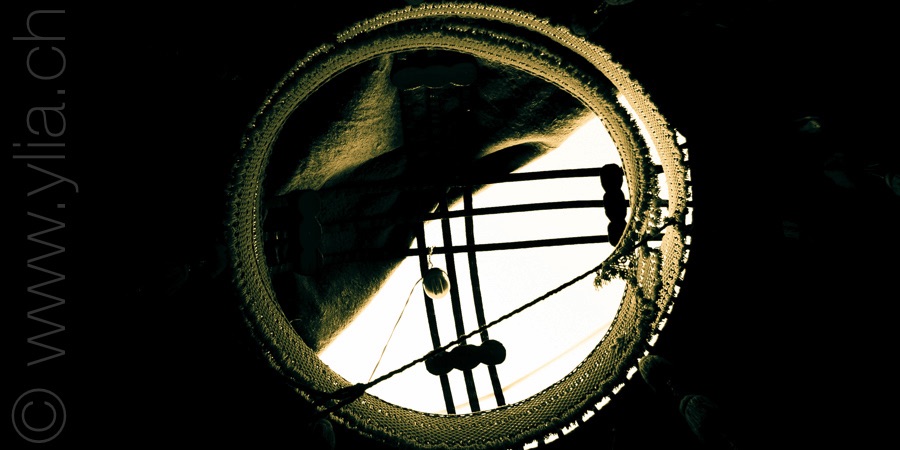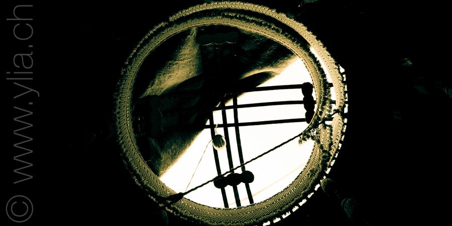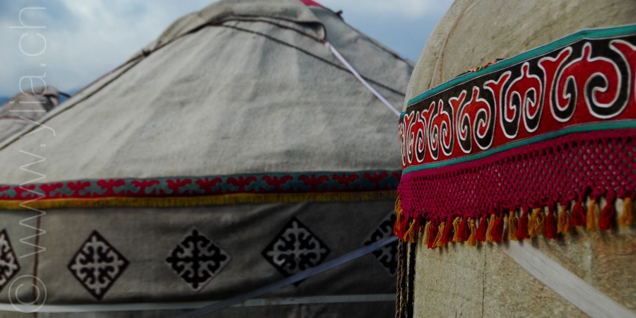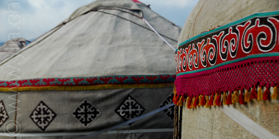 In this powerful scenery, the Kirghiz lifestyle took place. The yurts, boozi, appeared in these green meadows. The sun reflected the whiteness of their Ulducks and Tuldrucks, large pieces of felt, creating a warm and waterproof environment. They were placed over flexible wooden sticks, the kereges and the tchi. The Tyndynk, symbol of the Kirgiz flag, is a wheel that supported the roof, while leaving a central opening letting the light penetrating this universe of mutton smell. The colourful shyrdaks, felt carpet, created a warm-hearted atmosphere inside.