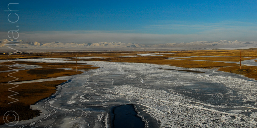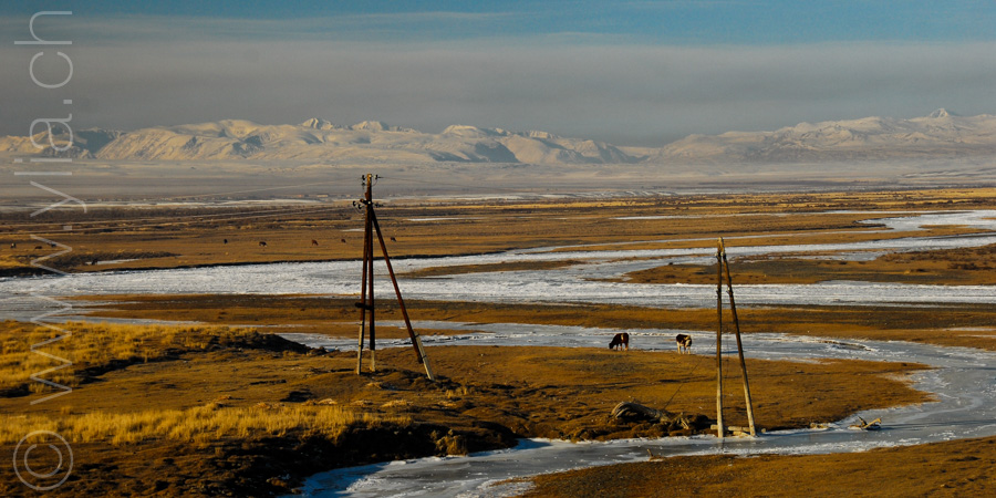 The mist that covers the whole plain, lay down a freezing humidity and creates a pastel blue filter that form a serene atmosphere. The silence enveloping your land seems to touch the high summits of the Altai Mountains, bringing back the echo of their whispers. The rivers are now icy formations, but the farouche water that freed itself in the rapids engenders a steam. And its waves are dissipating with lightness in an inspiring dance. Two horses with thick hair gallop freely in these gigantic spaces covered by snow, right in front of the alpine scenery.