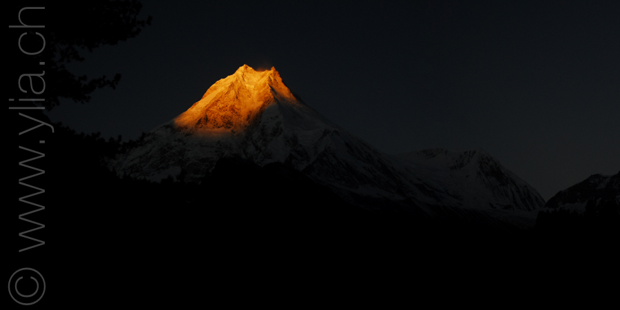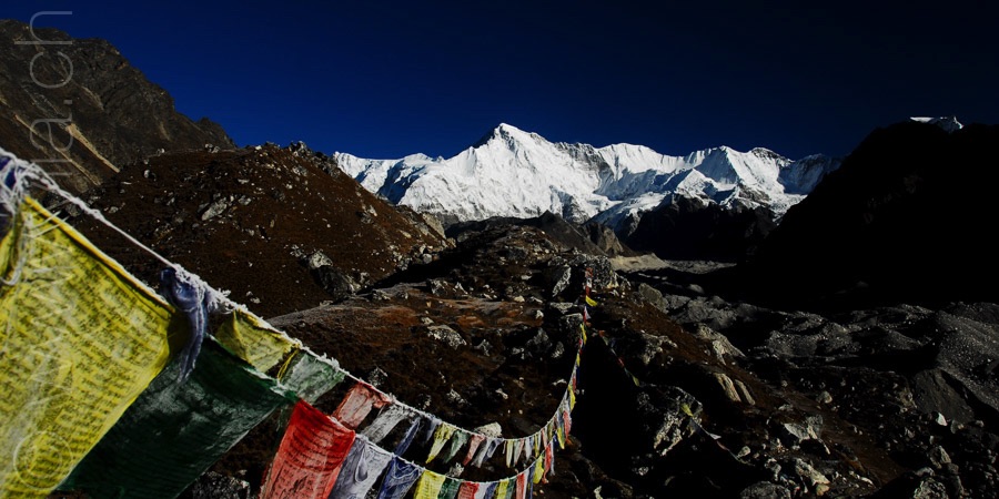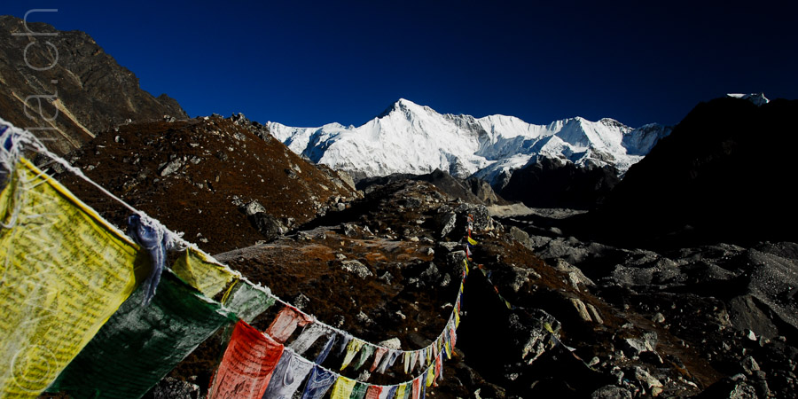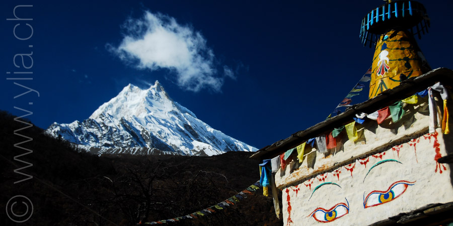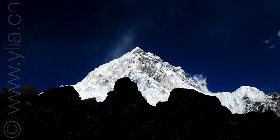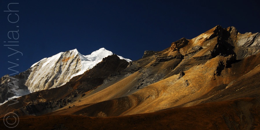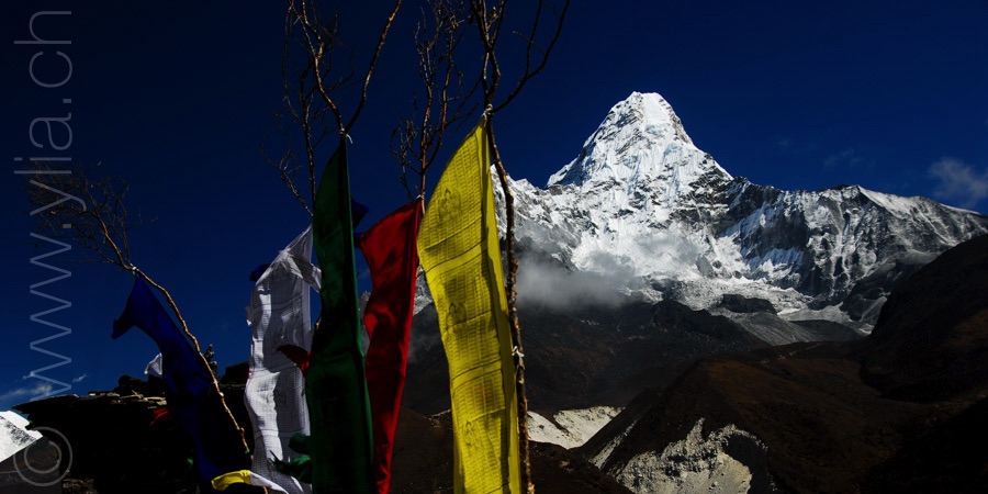 Later it is the encounter with the summits, with their faces, with their enigma, with their messages. The Everest, the Cho Yo, the Makalu, The Manaslu, the Ama Dablam, the Pumori, each of them reveal their personality, their power, their tenderness, their energy. In the heart of these sumptuous panoramas, in the sanctuary of the Himalaya, only contemplation can appreciate the majesty of the scenery, in the silence of unity.