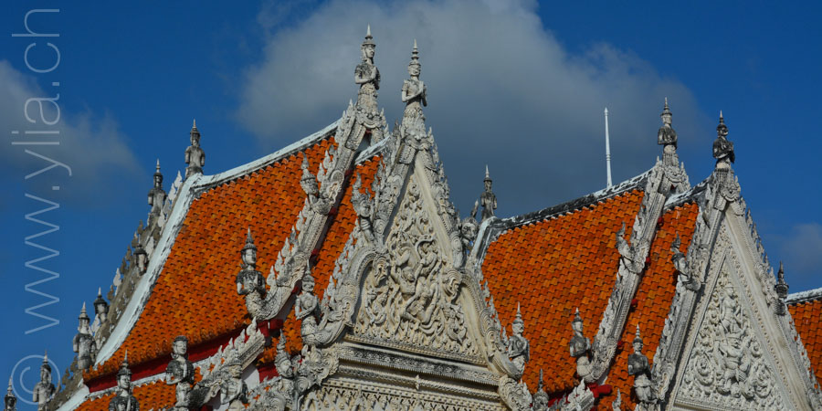 Thailand knew how to quench our desire for discoveries and magic. It showed us its paradisaical beaches, where cliffs fall in the water composed of myriads of green shimmers that reflects with the tropical forests, where the white shiny sand meet the corals, where the schools of fish play in the waves. It showed us its fantastic thai temples, the wat, perched on hilltops, lulled by the waves, integrated into the landscapes surrounded by cliffs, buried in the caves among bats with a fabulous light that comes from outside and that crosses with one ray the time of rocks. It showed us its wild hills near the Birman border, where the crisp air reminded us of the spaces of freedom. It took us in the middle of karstic mountains in outstanding canyons, in the alley of giants. It took us in a festival of flavors, where the tastes combine to create the exoticism in all its delicacy, where jasmine rice mingles with green curry, where spices create powerful emanations of ginger, galanga, lemongrass, chilli, lime leaves and fish sauce, where the seafood expose all its savors in a harmony of fragrance.