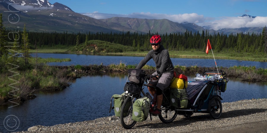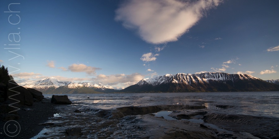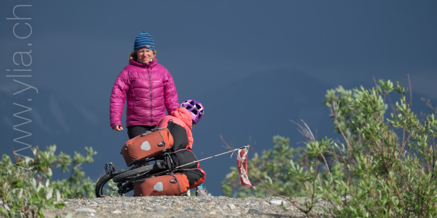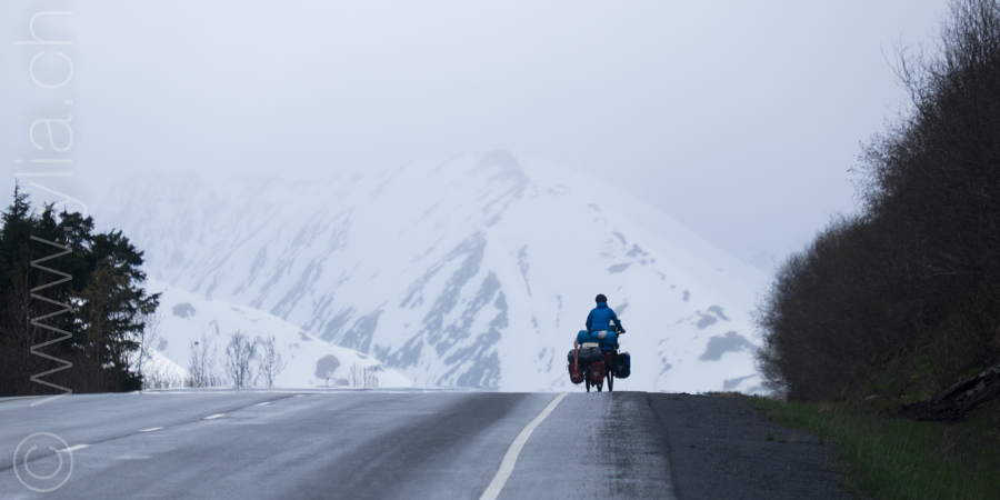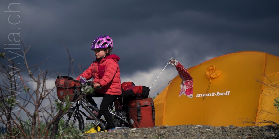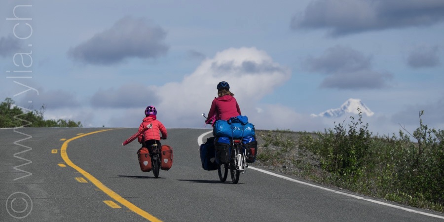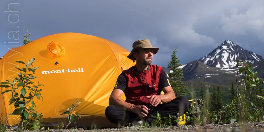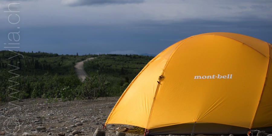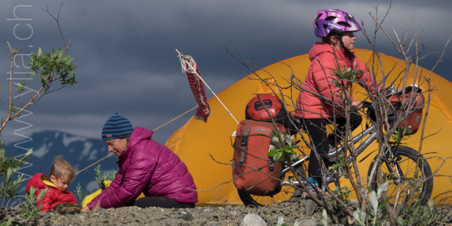 Their presence alone leads us to change our routine. We now have two tents, one for sleeping and one for eating in case of bad weather or as protection against mosquitoes. The latter will prove essential from the very first days. Welcomed by a blue sky along the Cook Inlet facing the Chugach Mountains, the weather is changing rapidly. We are bathed in freezing rain as we cycle beside the snow, the peaks covered in a mist of white veil.