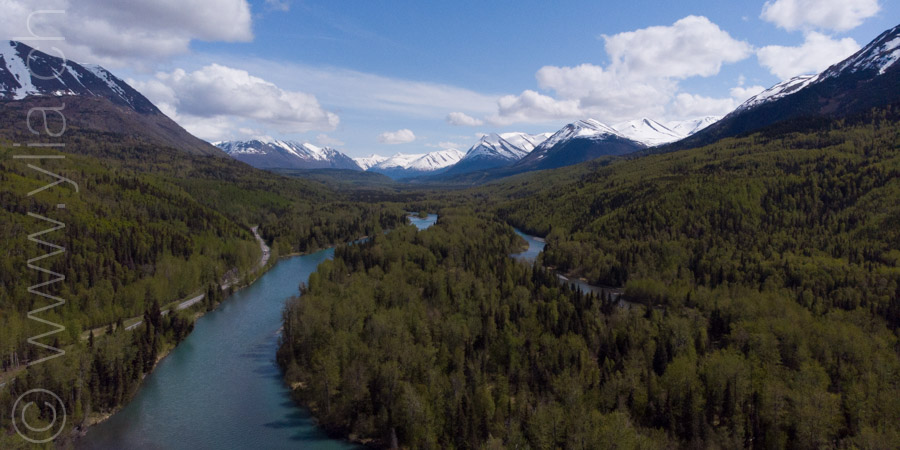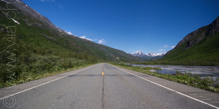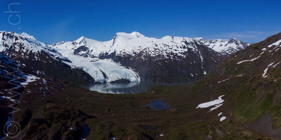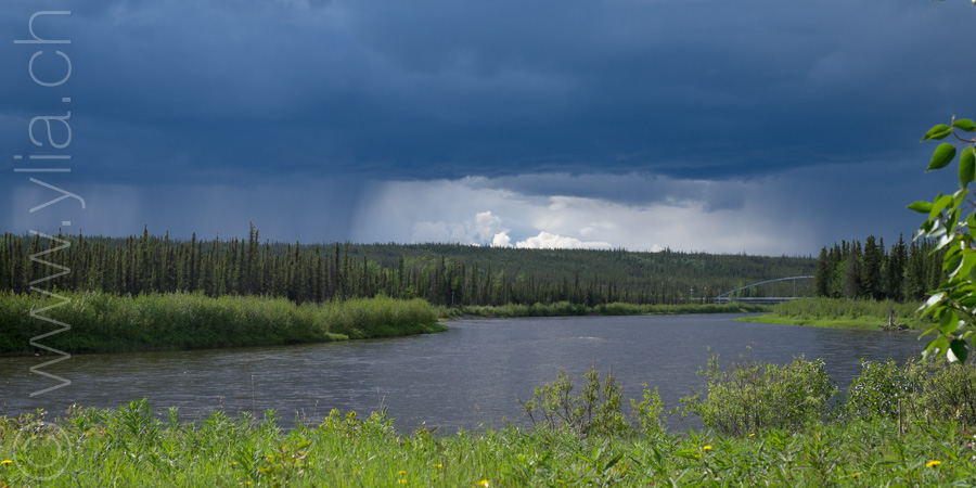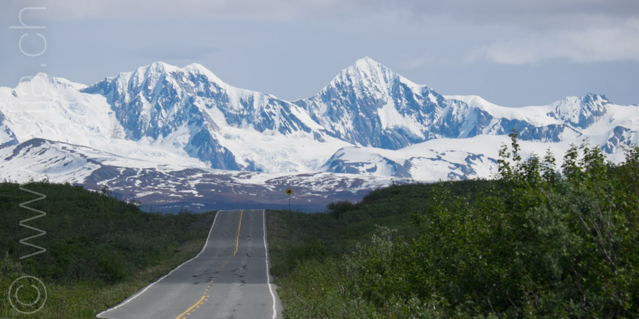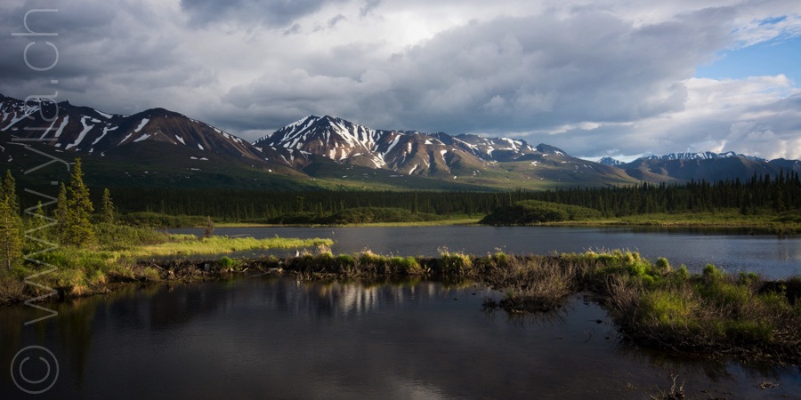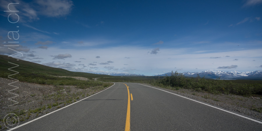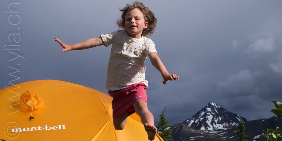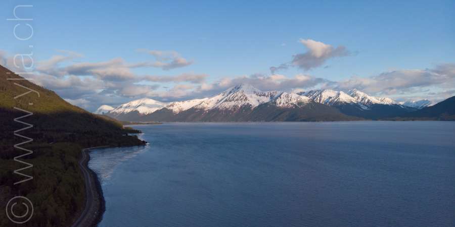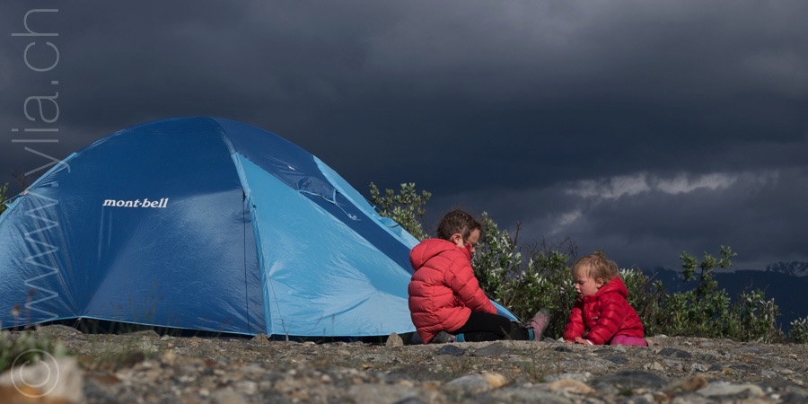 Their presence alone leads us to change our routine. We now have two tents, one for sleeping and one for eating in case of bad weather or as protection against mosquitoes. The latter will prove essential from the very first days. Welcomed by a blue sky along the Cook Inlet facing the Chugach Mountains, the weather is changing rapidly. We are bathed in freezing rain as we cycle beside the snow, the peaks covered in a mist of white veil.