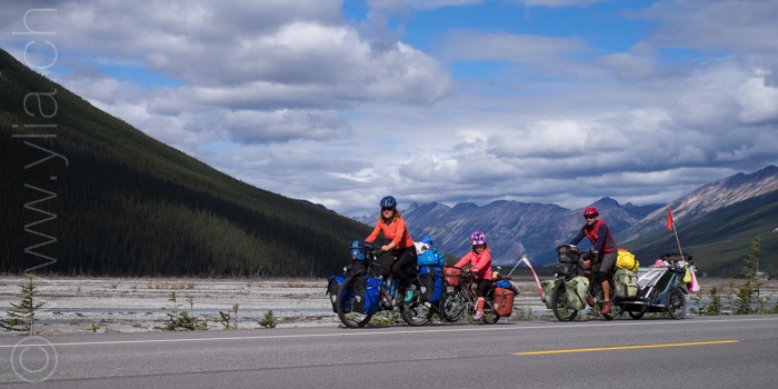 Our journey in British Columbia and Alberta is punctuated by extraordinary encounters, personalities who are a source of inspiration. Yet our daily lives are immersed in the vast spaces of Canada and its boreal forests. Arriving in the Rocky Mountains transforms the landscape. Nevertheless, our bodies are tired. They feel the deep fatigue of the endless days in the North. The rain that regularly punctuates our journey tempers our elation. Landscapes always carry us further, they are our source of inspiration and motivation. We cross the Icefields Parkway. Here we are in the heart of the Rockies and its extraordinary formations unfold above us. We are surrounded by these giants that make up spectacular landscapes. We ride close to the glaciers and dive into the lakes. These glacial lakes have fabulous colours, so intense.