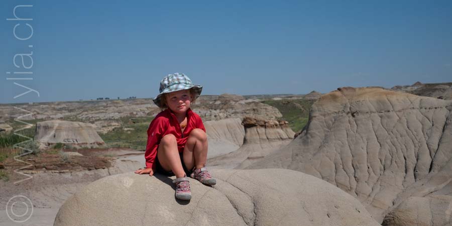 « Jump! » exclaims Fibie, eager to swim in the wide Red Deer River. The water is brown and muddy. But it's so hot that the idea of plunging our bodies into the water is delicious. This river has created the "Bad Lands", lands that cannot be cultivated. These lands are formations of sedimentary rocks and clay that have been eroded by wind and water. Nayla and Fibie run, climb, and explore this gigantic maze in the Dinosaur Valley with our friend Jim.