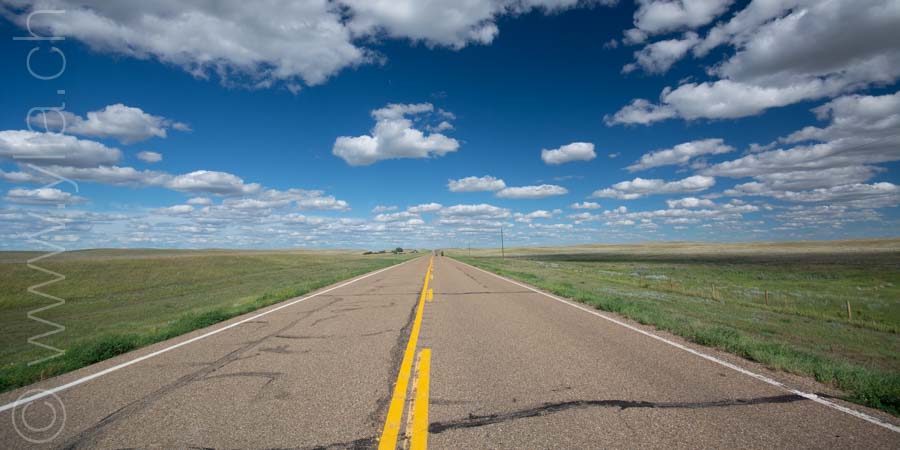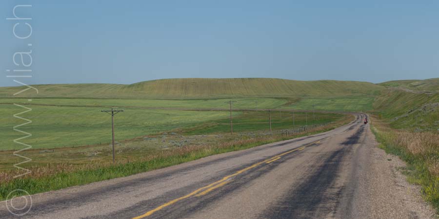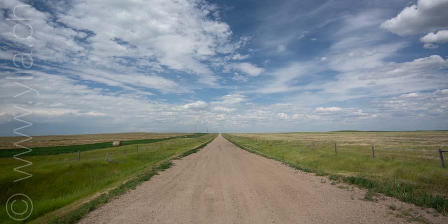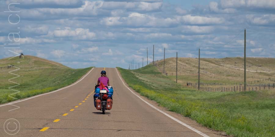 Cycling in the prairies is to imbue all our senses with what surrounds us. When the eyes plunge into a monotonous mantra, the other senses open, to let in new perceptions. Smells are unique. Each breath raises the scents of aromatic plants, sometimes sweet, gentle, delicate, exquisite or velvety. The song of crickets or that of birds accompany us from dawn to dusk in vivid symphonies or the regular chorus of insects. Even our skin brings us sensations, when it is not the hundreds of mosquitoes that bite us. The gaze then shifts, it surprises three Great Horned Owls in their flight. It spots the antelopes that frolic in these vast prairies. It is the fastest mammal in the northern hemisphere and can detect movement up to 6.5 km away. Then it is the aerial choreography of about thirty pelicans, or wild geese that begin their migration at the end of the summer. The sky dominates the landscape. It is these blues, each day different, that infuse the earth.The clouds form aquarelle paintings, sometimes dramatic scenes. At night, only the howls of coyotes disturb the peace of the celestial vault. In this infinite sky, we feel tiny, below this dance of stars.