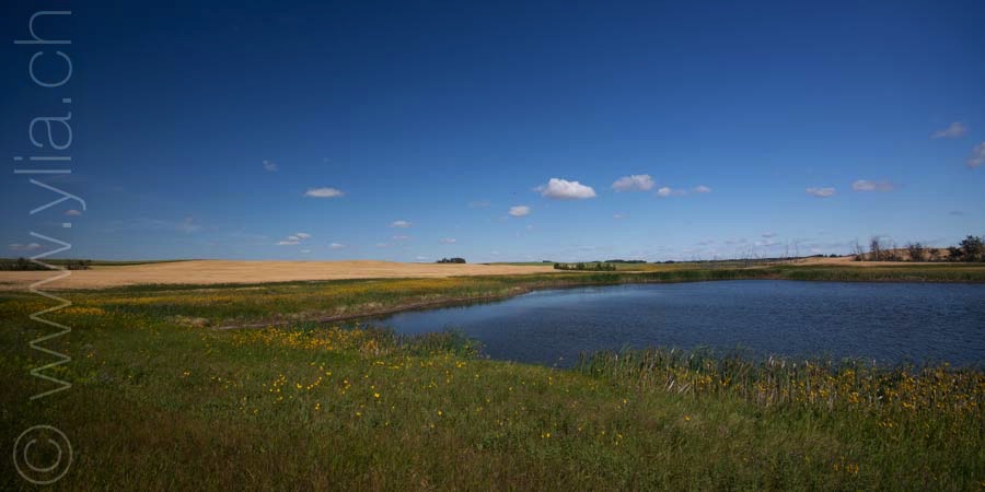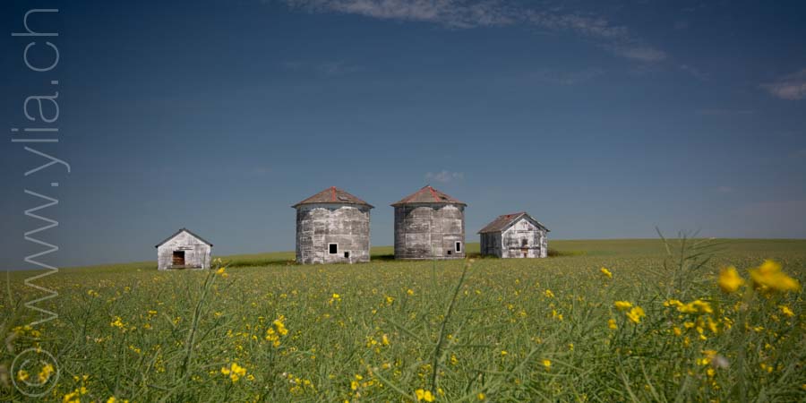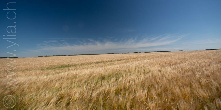 In Saskatchewan, we find in every village the grain towers that rise into the sky, like a leitmotif of the prairies. The ears of wheat are now golden yellow. They dance in the breeze or compose moving scenes in the breath of a rushing wind. We then have the sensation of looking at the sea, like waves dancing in the field.