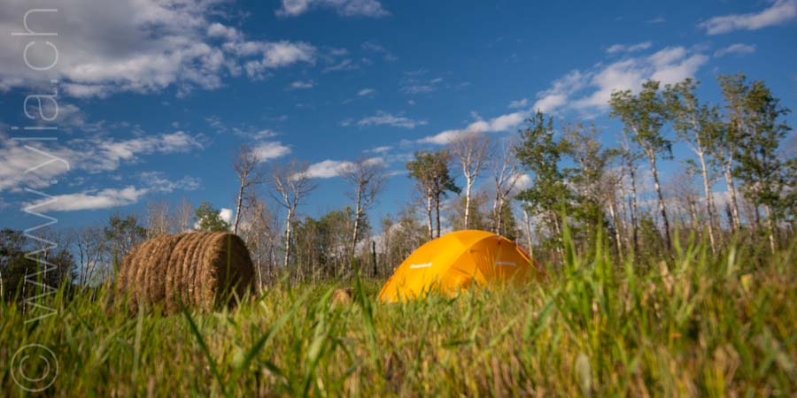 The Montpetit family stops there with their RV to offer us ice cream and cold drinks. It was their encounter that traced our itinerary and that is how we chose the Northern Saskatchewan route to meet them again in Bruno. Their presence touched us by their sincerity and openness of heart. We were also grateful for the welcome we received all along the prairies, despite the world situation. A heat wave has set in on the territory. The heat hits us and rises from the road like the breath of a furnace. We are compelled to find shade. But the prairies stretch as far as the eye can see without trees on the horizon. Only the surroundings of private properties have saving shade. We are then pushed to ask for a shady spot to pitch the tent. We never had to ask for a second time.