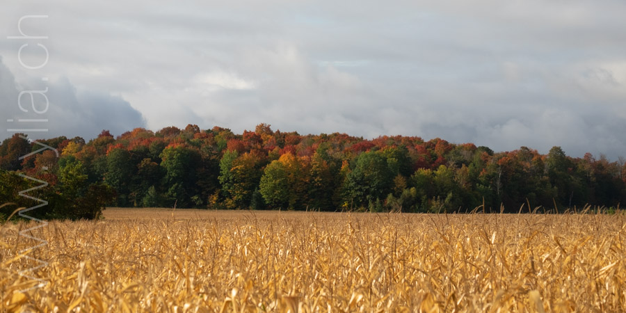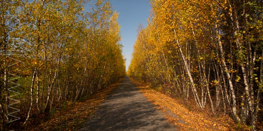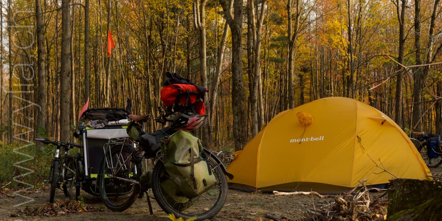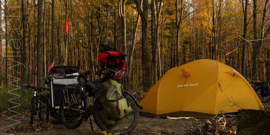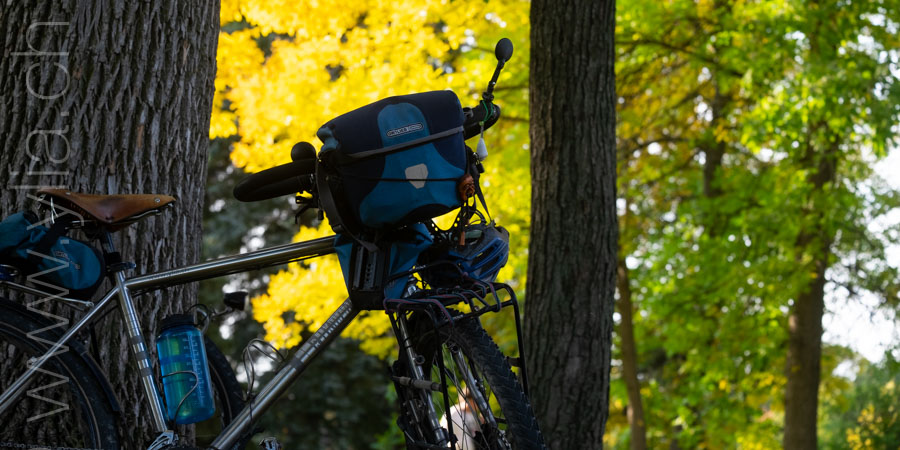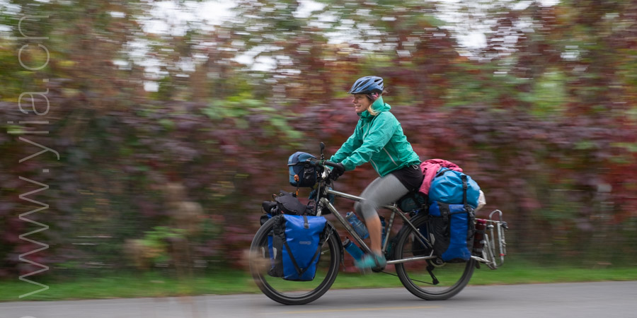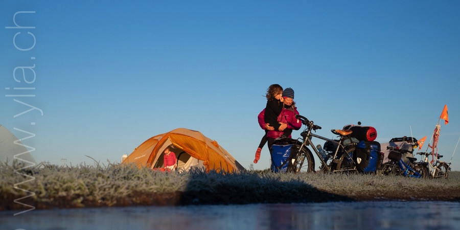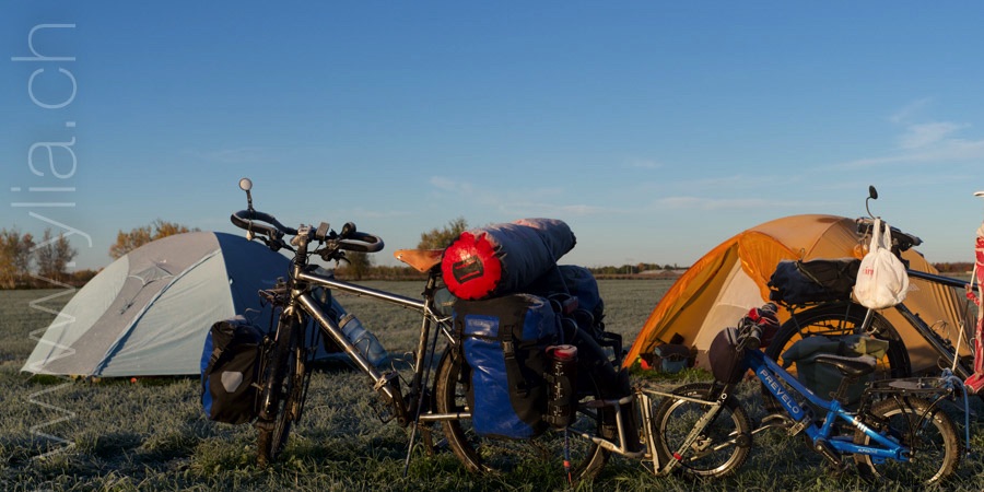 Every day, the colorful trees are becoming more and more naked. The power of the wind speeds up the process. In the early morning, the air is now bitterly cold. It is -8°C. Our water bottles are just a big ice cube and the fog has created beautiful frost formations on our bikes and panniers.