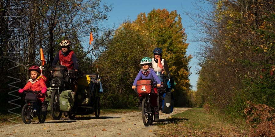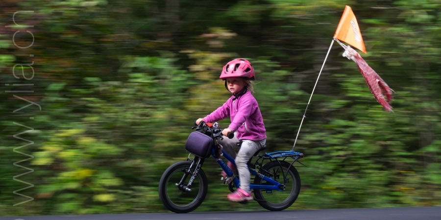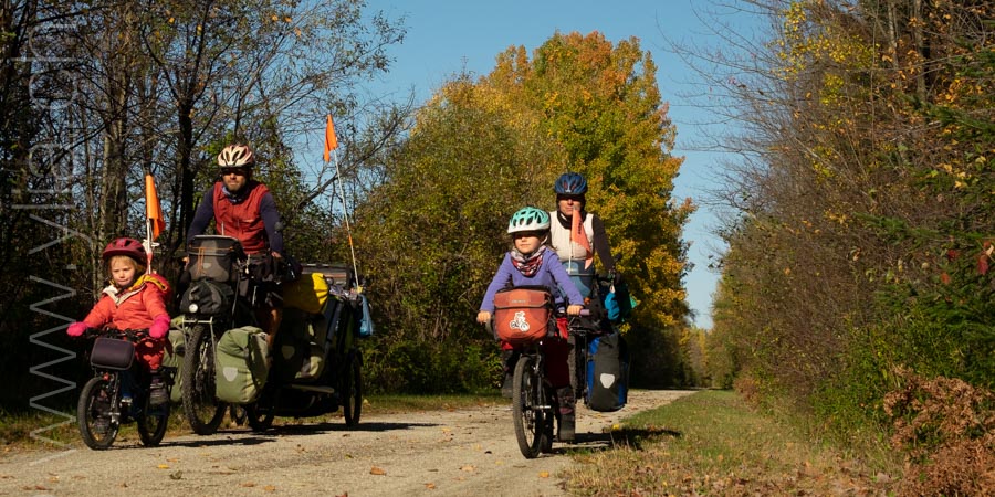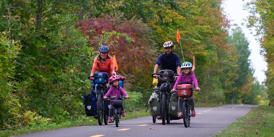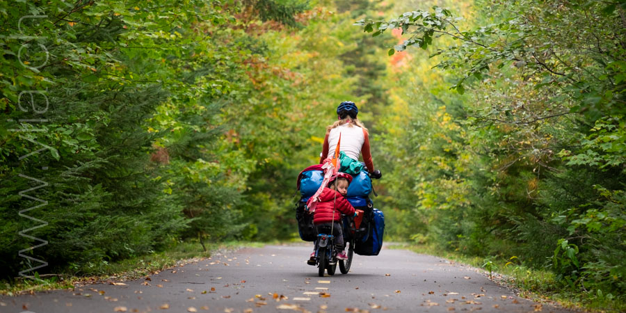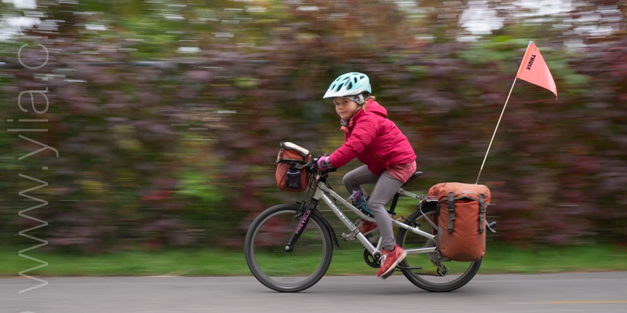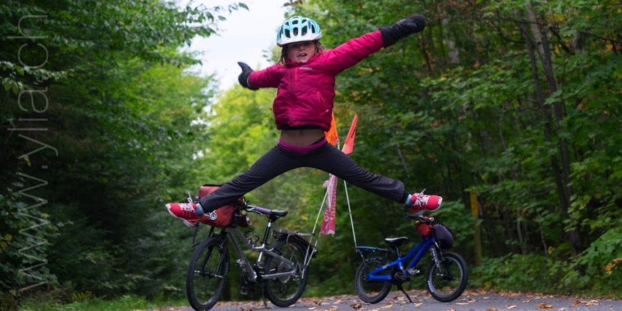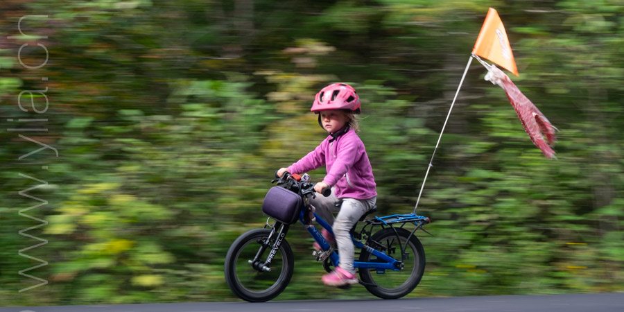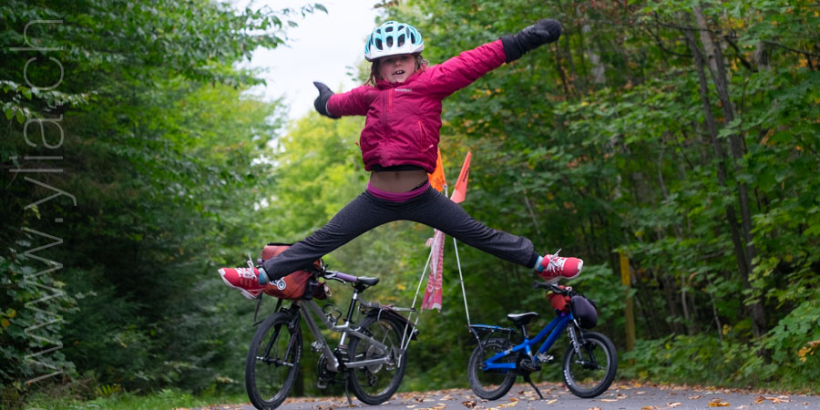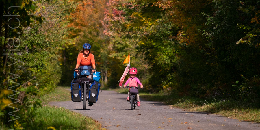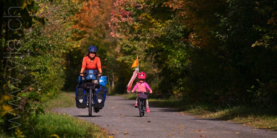 We take "les routes vertes" of Quebec, where Fibie can cycle. She is so excited that she rides 15 kilometers, and she is just three years old. She is so proud to be on her bike and excited to be able to ride for such a long time. The climbs are tiring, so we enjoy lots of small breaks. At just three years old, she is riding her bike and now she is swimming too!