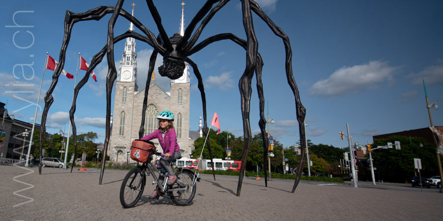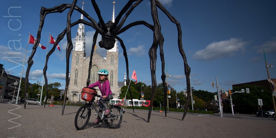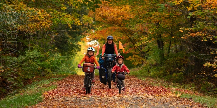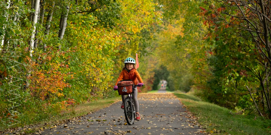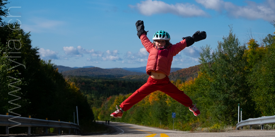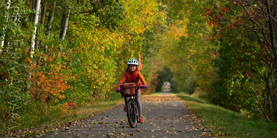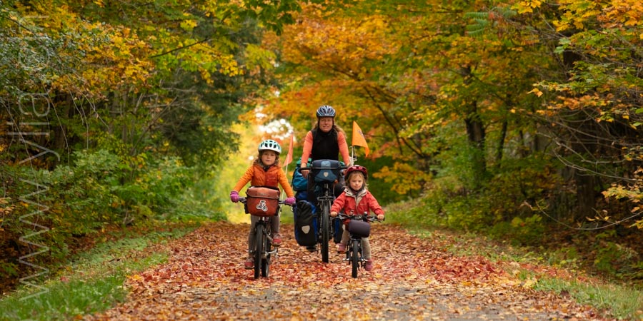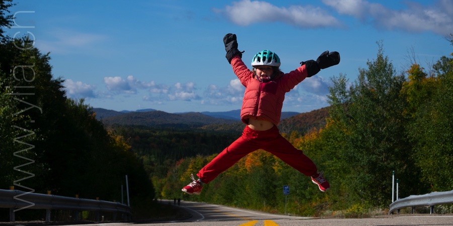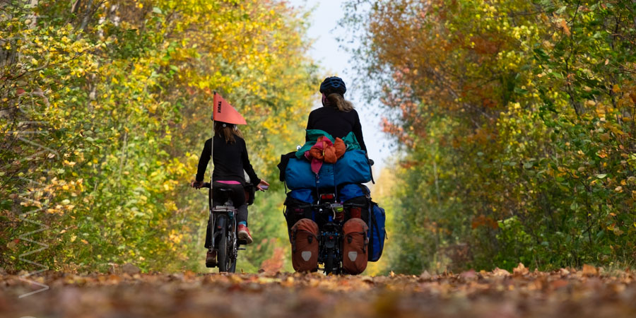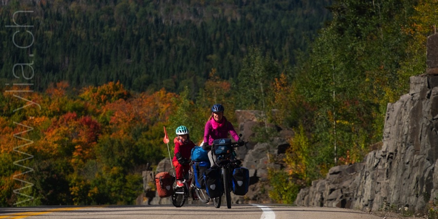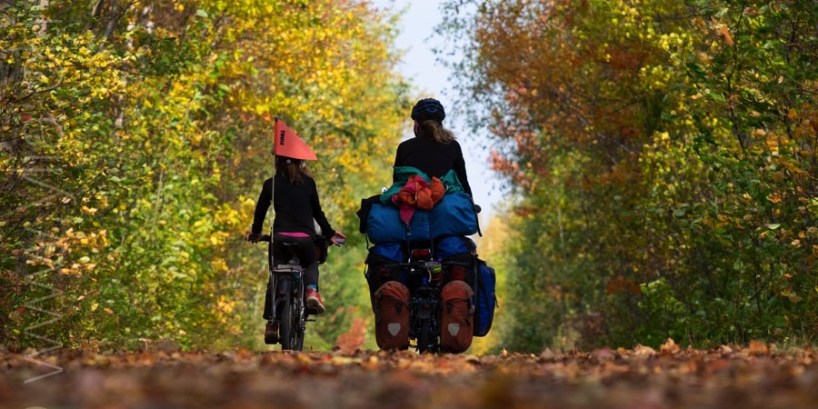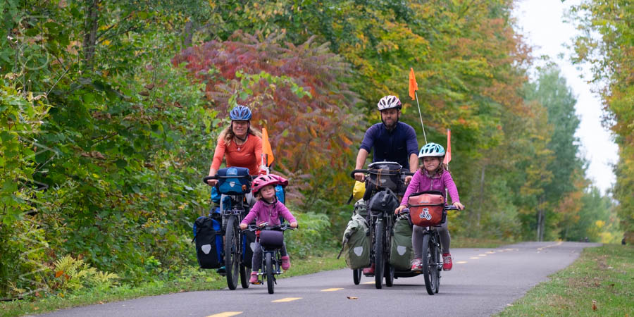 We take "les routes vertes" of Quebec, where Fibie can cycle. She is so excited that she rides 15 kilometers, and she is just three years old. She is so proud to be on her bike and excited to be able to ride for such a long time. The climbs are tiring, so we enjoy lots of small breaks. At just three years old, she is riding her bike and now she is swimming too!