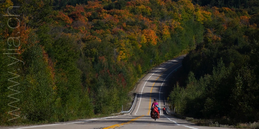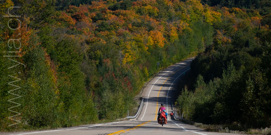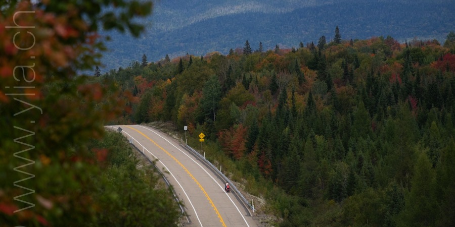 It is one of the mythical roads in Quebec. It passes through the mountains of Lanaudière, and includes steep climbs with slopes of more than 10%. The landscape is absolutely grandiose. The round-shaped mountains are all around us. They are covered with deciduous forests that are in full transformation. They are adorned with their most beautiful colors. These leaves create luminous paintings with bright colors. At the top of the passes, after the intensity of the effort, the earth offers us its most beautiful scenery.
