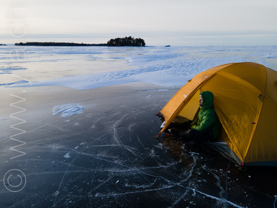 Lake Saint-Jean is entirely frozen, an ice desert of more than 1,000 km2. It is our playground. At the beginning of the winter, strong winds created a large, tangled ice barrier. Rain and cold temperatures then smoothed this frozen expanse. We take our skates and set up the tent on this clear, sometimes black ice. We feel as if we are walking on the abyss. We look down to see how thick the ice is, but we have the feeling that we are facing the infinite, at times to the point of vertigo.