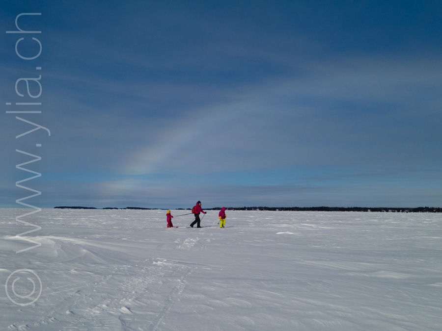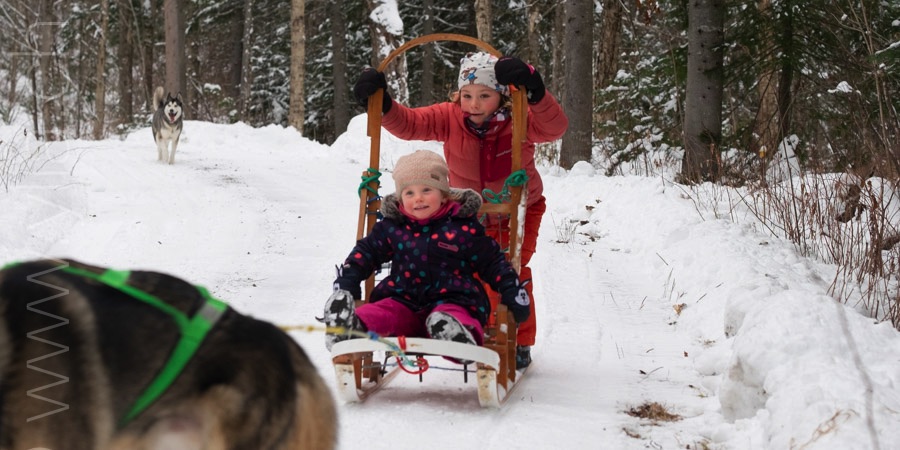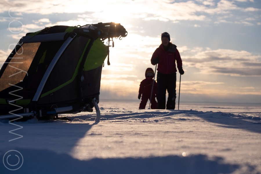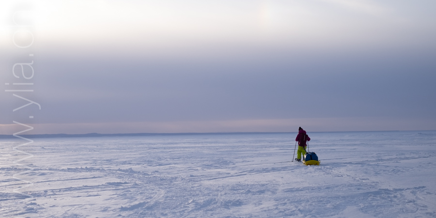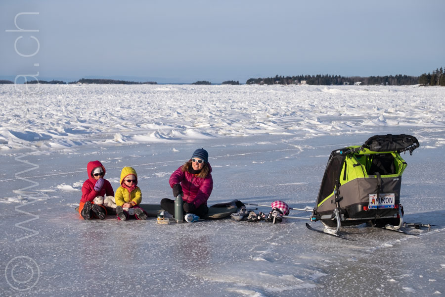 Now, the lake is covered with snow. We take our snowshoes or cross-country skis to explore this white desert. Fibie is pulled by a rope attached to the Thule chariot that Xavier moves. We transformed it for the winter by replacing the wheels with skis. We set off facing the gigantic white expanse of Lac Saint-Jean. Snow lines caused by the wind form sastrugi.