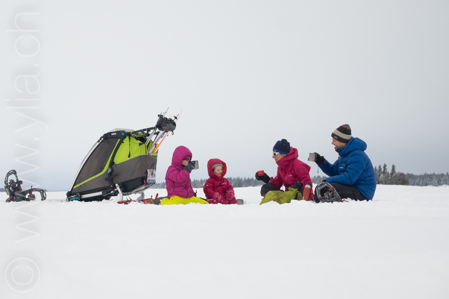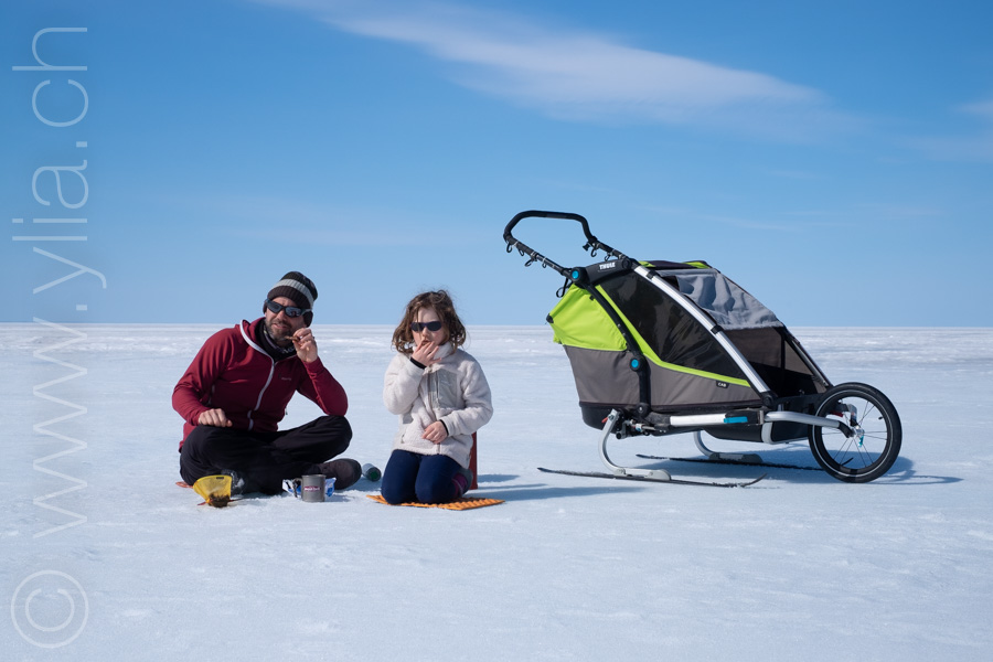 Today the sun is shining, with a light breeze. We head north, listening to the rustling of the snow and the cracking of the ice. In front of us, there are no visual landmarks, only this white expanse that reaches the horizon. This infinite attracts us and makes us feel free. We decide to stop for a picnic. It is -20°C. The sun shines brightly on the pristine snow. We enjoy the joys of the winter in Quebec.